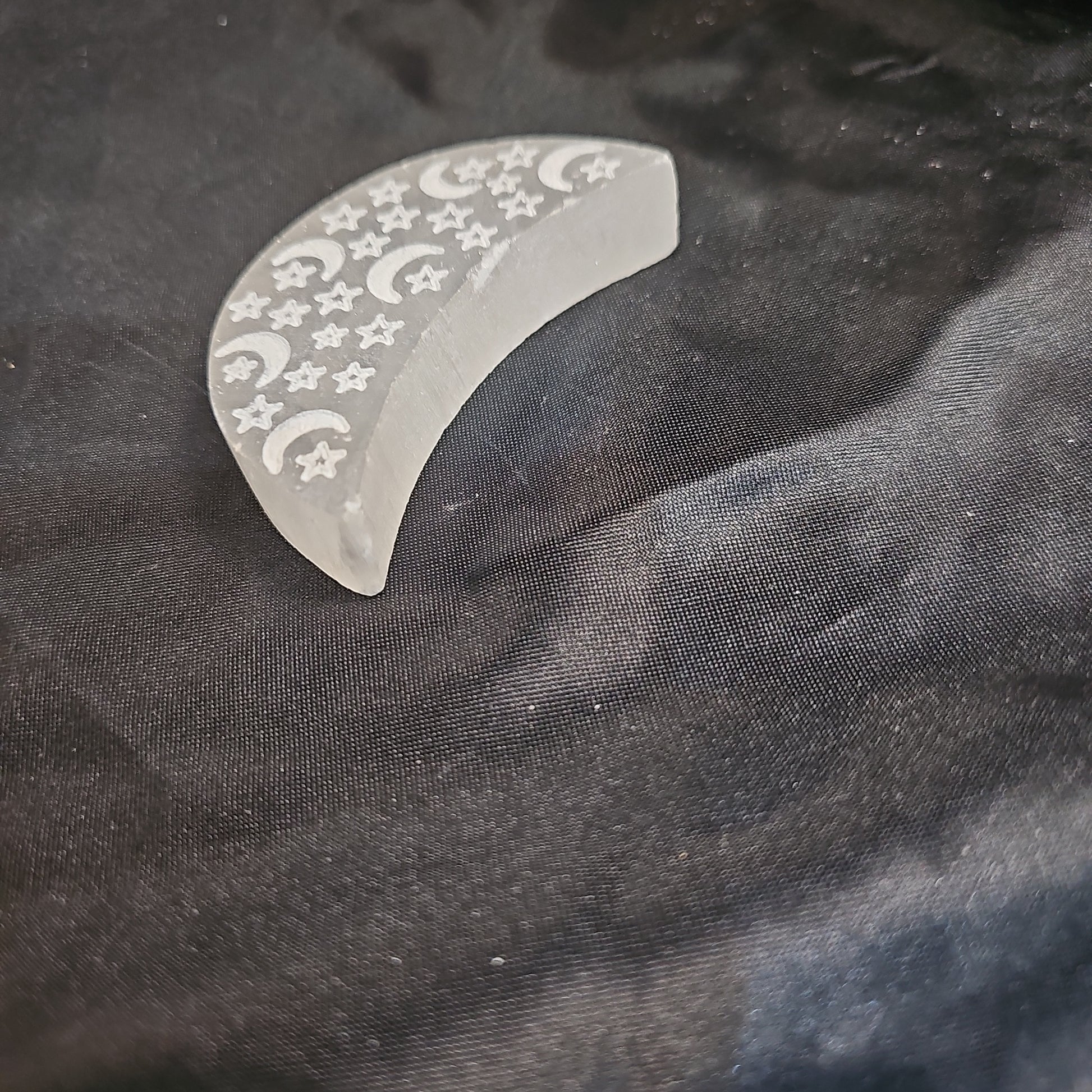 Selenite Crescent Moon w/Etched Moons and Stars - 3"