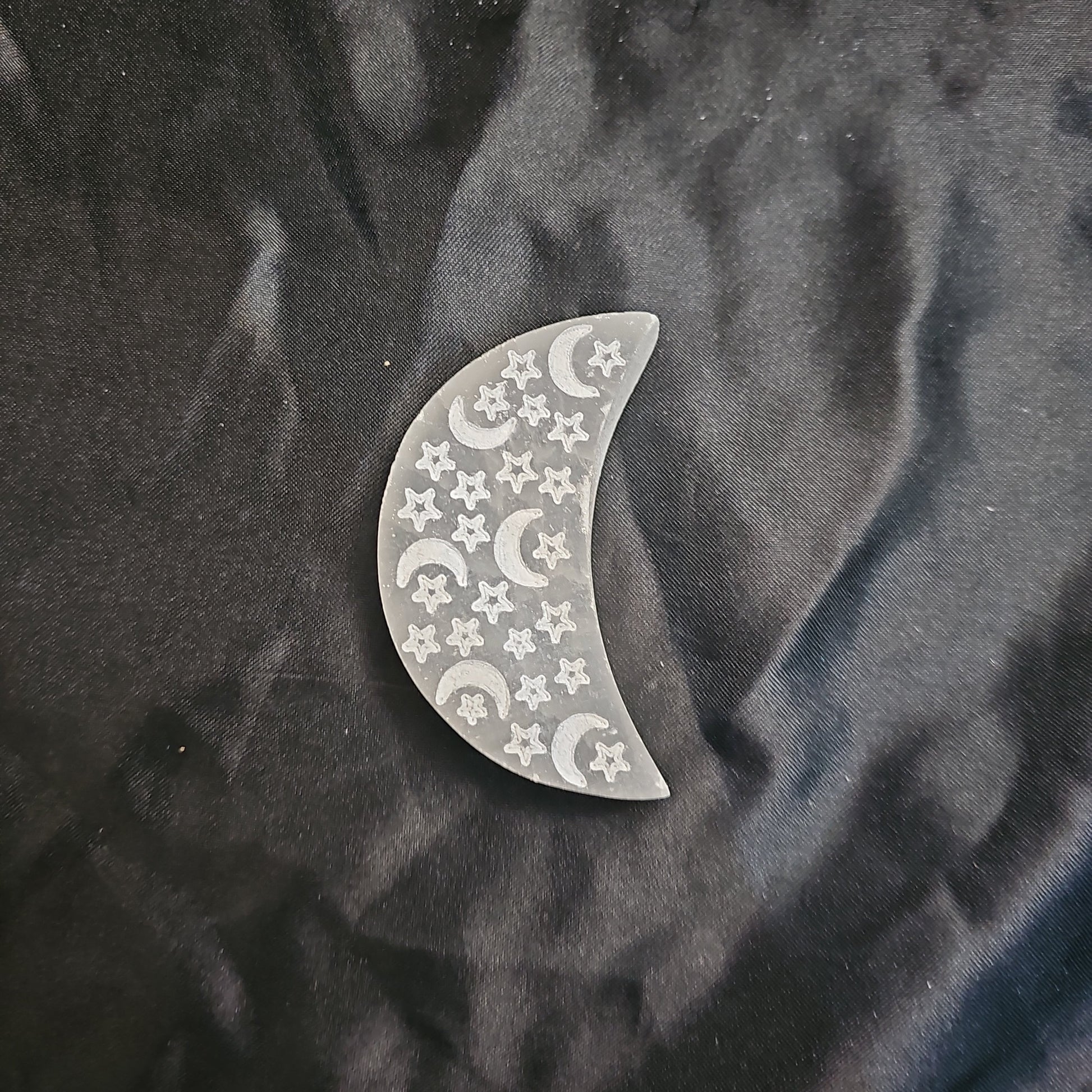 Selenite Crescent Moon w/Etched Moons and Stars - 6"