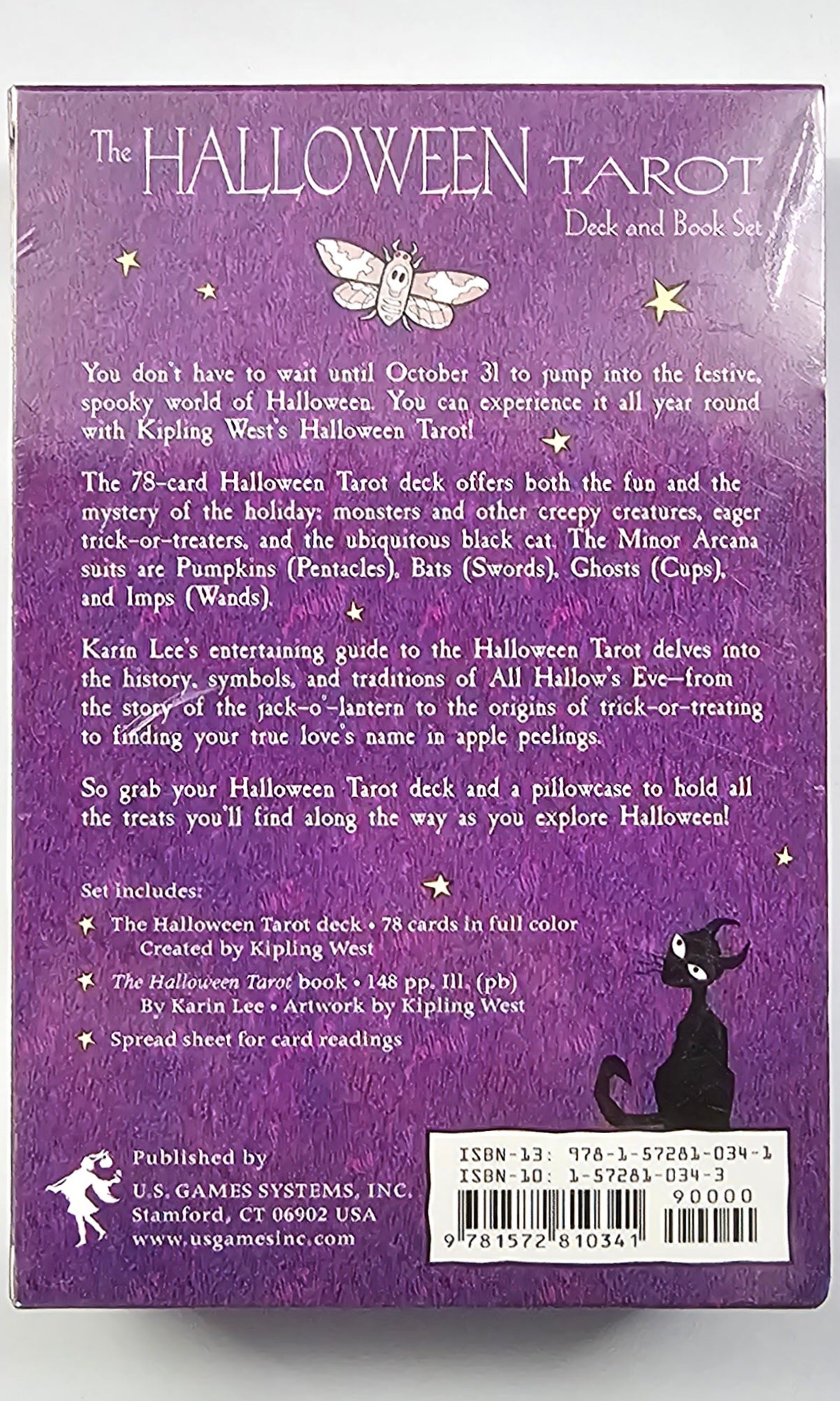 The Halloween Tarot Deck and Book Set includes the classic Halloween Tarot Deck (Deck can be purchased separately) and 140-page illustrated book, in which author Karin Lee explores the exciting thrills and chills of Halloween. For each card of Halloween Tarot, she shares the story of its association, for example, The Emperor as Frankenstein, and The Hermit as the Mad Scientist. Both divinatory and reversed meanings are given, as well as several sample tarot layouts including the Celtic Cross spread.